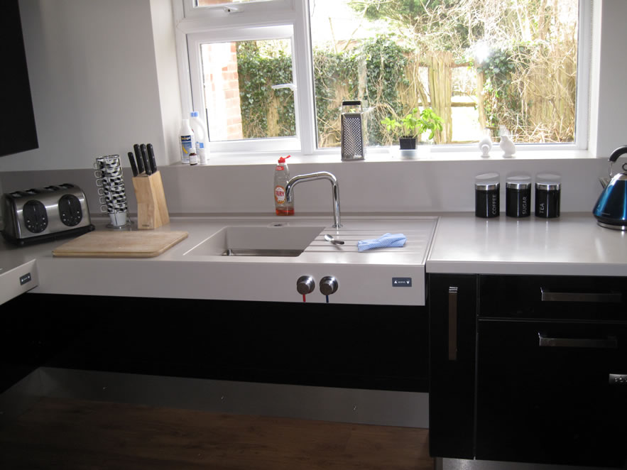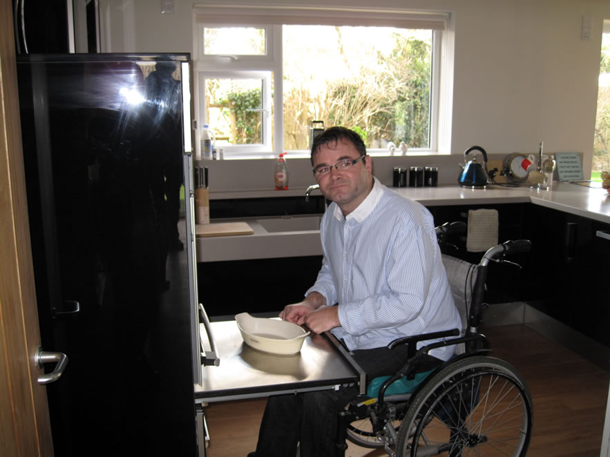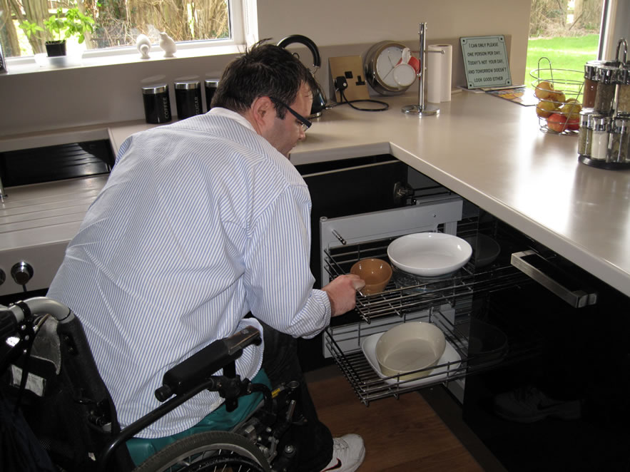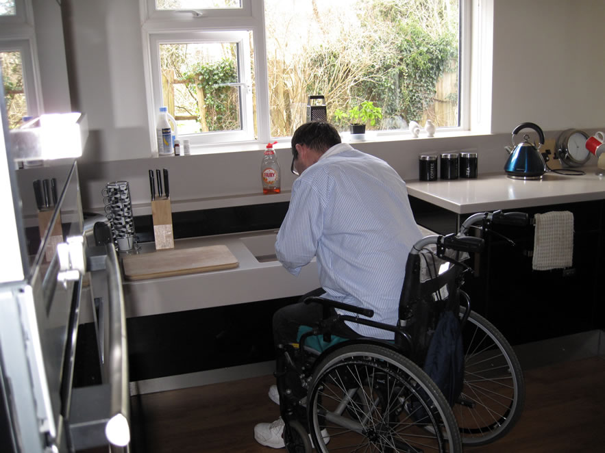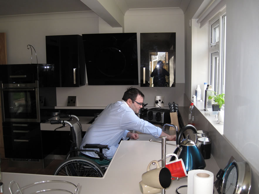 The kitchen has an adjustable height work surface which incorporates the sink and hob. The enables the client to lower the surface with the press of a button to the ideal height for him to work at from his wheelchair. Carers or family can then raise it to a suitable height for them if they are using it.