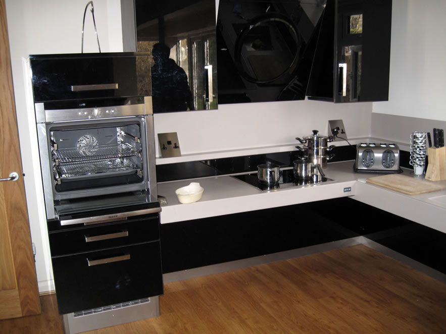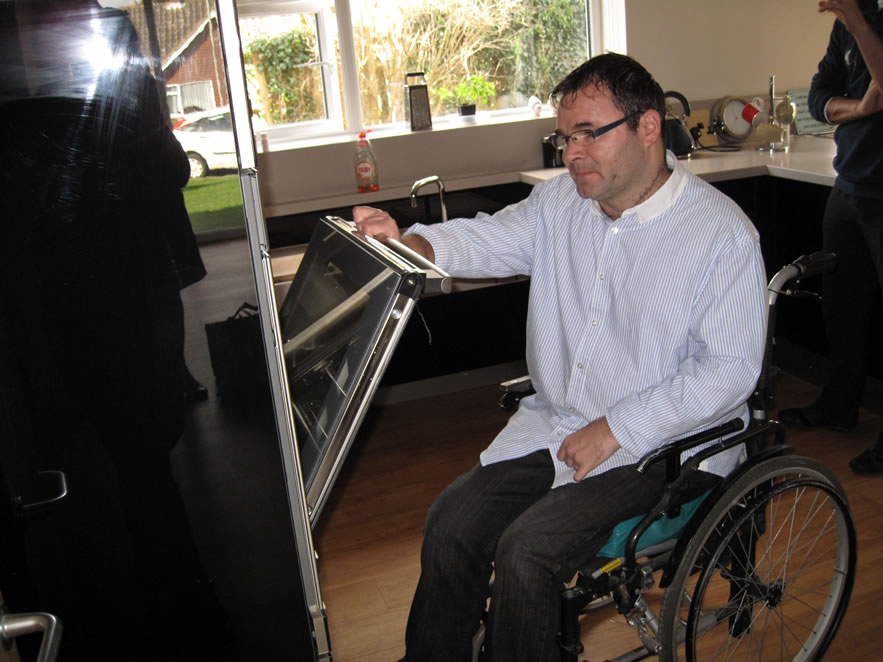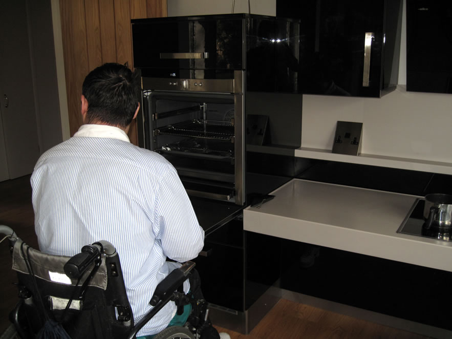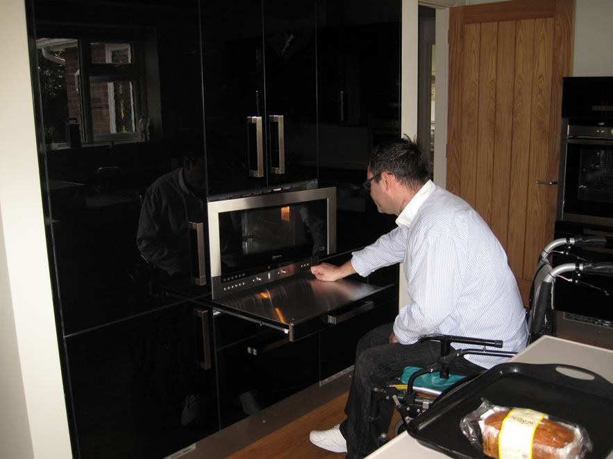The oven is wall mounted at a suitable height for the client to use from his wheelchair. The door folds out and then slides under the oven to enable to client to get close to the oven when removing hot dishes. There is also a pull out shelf under the oven, which is can pull out to place dishes etc on. He can push his wheelchair underneath this to get as close as possible.