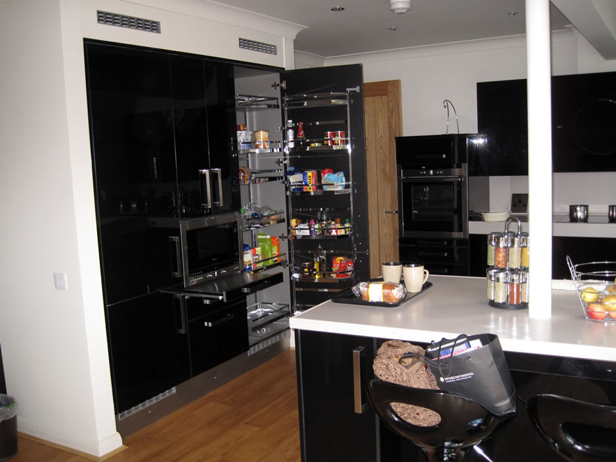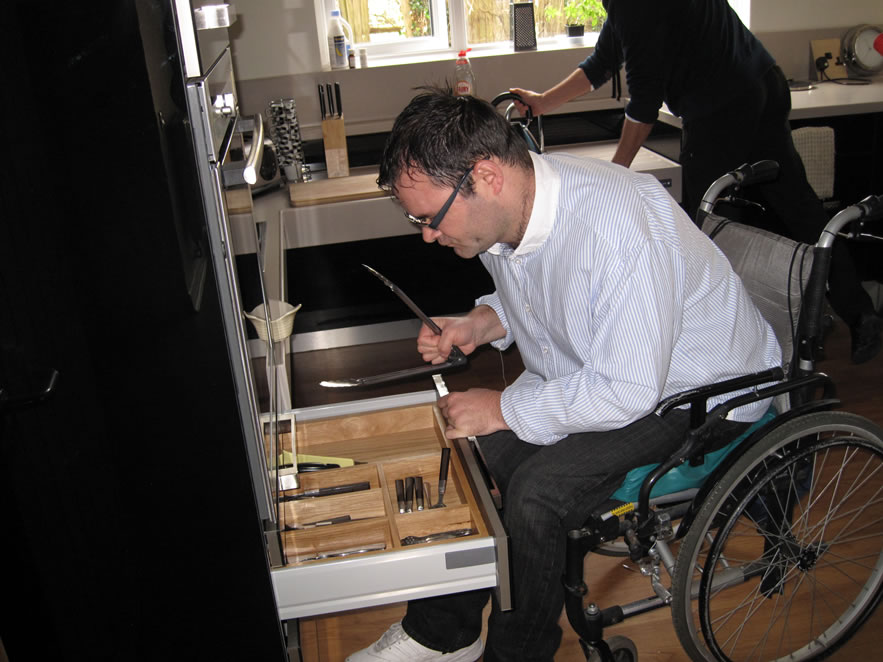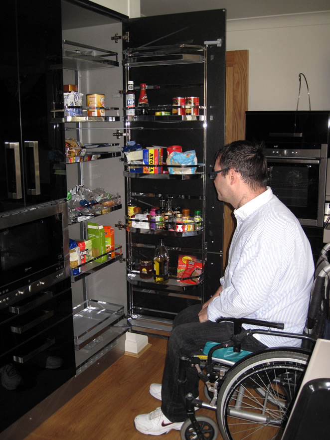 There is a pull out larder, which means the shelves come out so that he does not have to reach right into the back of the cupboard. There is also a pull out corner cupboard for the same reason.