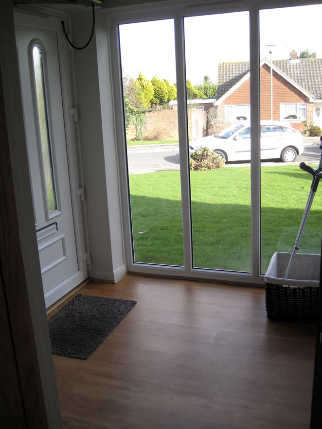 The front door has an electric door opener and intercom system. This enable the client to open, close and lock the door with the push of a button on a fob. Therefore, there is no fiddly opening the door from his wheelchair. The intercom allows him to give people access into his home without having to go to the front door. He can speak to them and grant them access if he wishes.