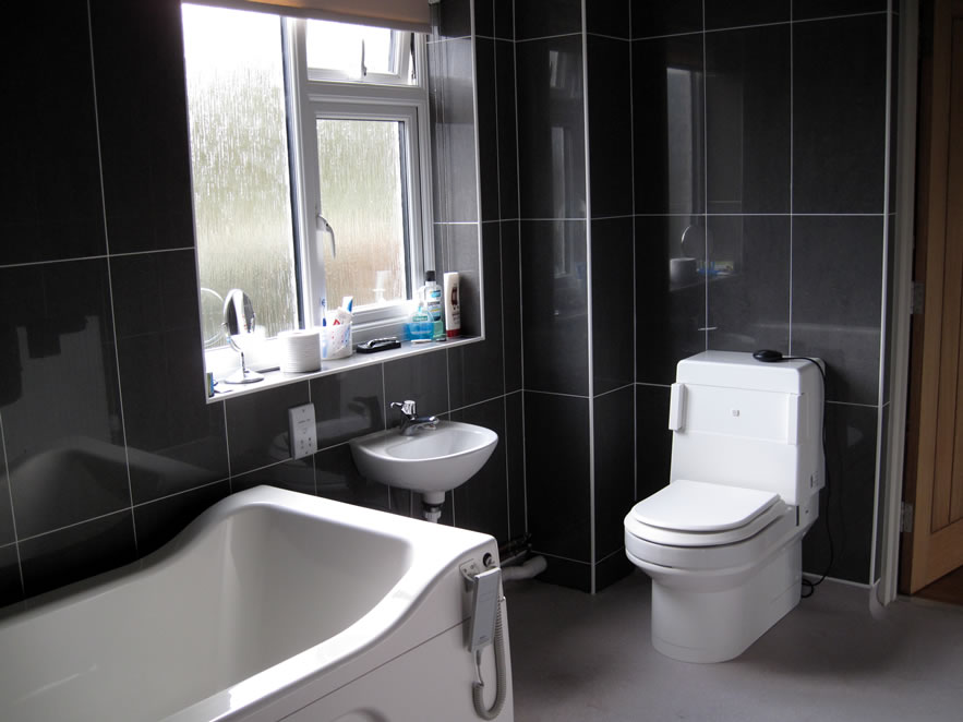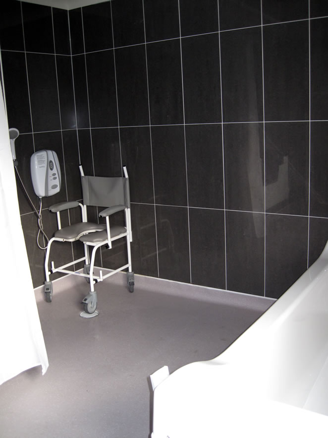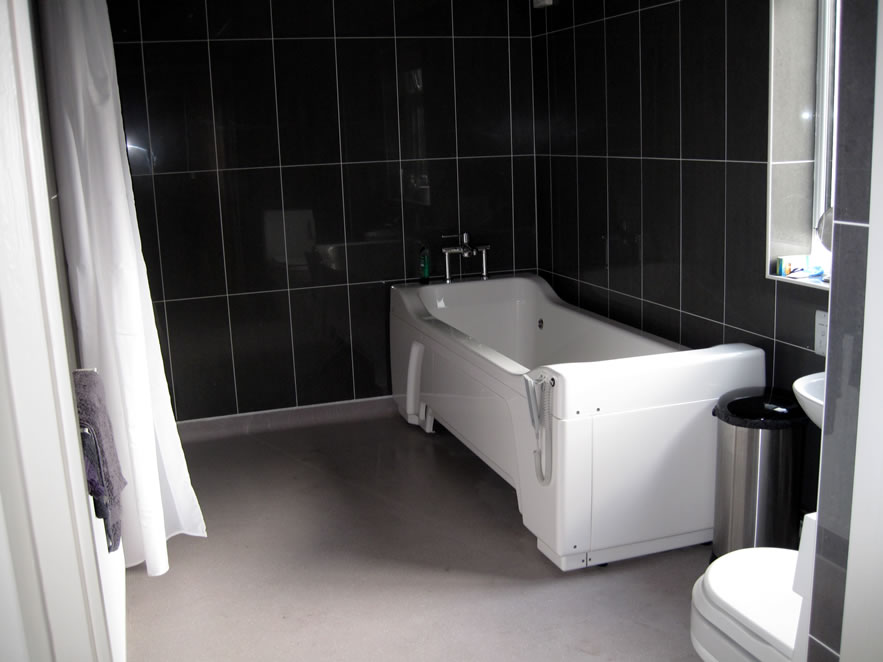 There is a height adjustable bath, with a bath seat (not yet shown in pictures as not fitted at the time). The bath seat will raise and swivel with the push of a button, and lower client into the bath. If he requires assistance with bathing, the carers can raise the height of the bath so that they are not bending over.