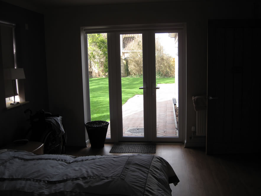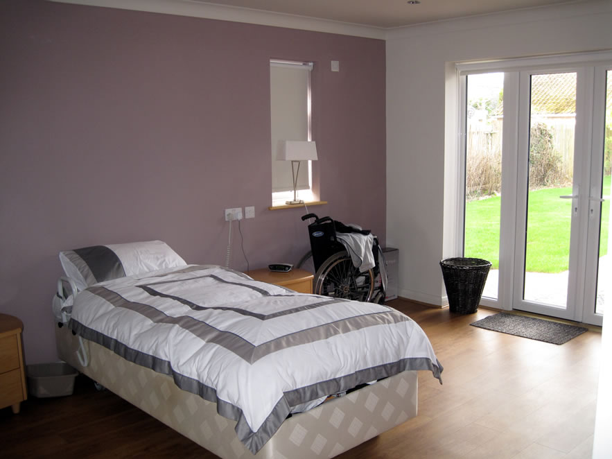 His bedroom is large enough to enable him to get around in his wheelchair with no obstacles. The ceilings have been prepared in case he requires a ceiling track hoist in the future, so they can be easily fitted.
