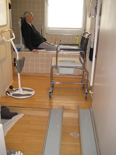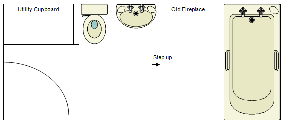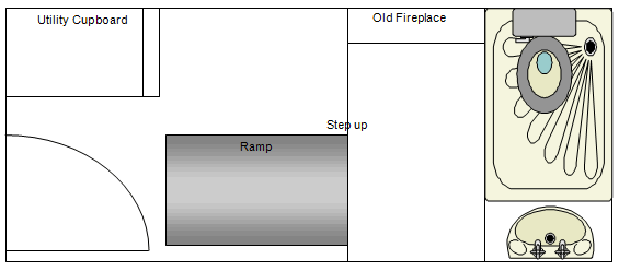 2) The second option would be a bath hoist and portable ramp. This would enable transfer into the bath if the person is unable to slide over to the bath lift. This can be used with the wheeled seat to reduce the number of transfers if required. So the person would just be pushed up the ramp on the wheeled seat, and then the seat would be attached to the hoist and the person lifted and lowered into the bath. 3) The third option would be the most disruptive and the most expensive but it would meet all long term needs. In this case, the step cannot be removed the make the bathroom level due to the heating and pipe work under the step. A ramp can be fitted to the area (again portable or a permanent structure could be made.) The shelf area beside the toilet would need to be removed to create more space. The bath would then be taken out and a level access shower (wet room)? fitted. In this instance, the soil stack is behind the old fireplace in the middle of the bathroom which causes some problems. If a permanent ramp was to be fitted, the toilet and basin could no longer be accessed where they are as the ramp would be blocking the access. These would need to be refitted on the shower level. The best way to conserve space here, is to put the toilet in the shower area. When this is not being used as shower, the doors would be folded back and it would just be a toilet. The person can then be wheeled over the toilet on the wheeled commode. The basin would also be relocated onto this level to enable access. |